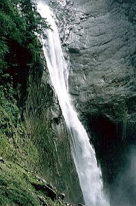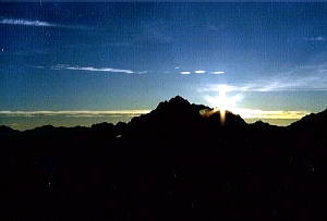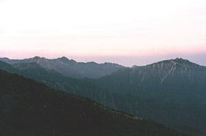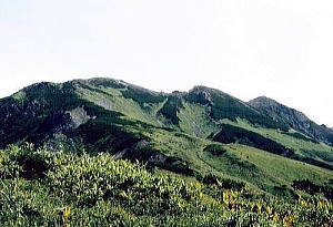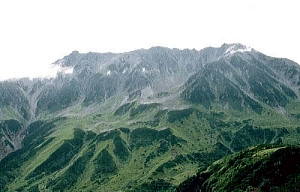 夏と言えば、やはり日本アルプスである。 雄大な風景、爽やかな稜線歩き、咲き乱れる高山植物等々の夏ならではの魅力が満載だ。 冬でも魅力があるという向きには悪しからず、私は極度の寒がりなので、雪があるというだけで動く気力を失ってしまう体質なのである。 ともあれ、アクセスが容易で、展望が良く、お花畑が期待出来て、更に滝まで見れてしまう、そんな欲張りなコースがこの大日三山の縦走なのである。 そんな訳で、8月7日の20時頃に自宅を出発する。 立山までは北陸自動車道で楽をして、翌1時過ぎにアルペンルート立山駅に到着する。 が、何とここでいきなりアクシデント発生! 当初の予定では称名の滝から大日平経由で大日小屋(泊)、翌日に大日岳〜奥大日岳を縦走し、アルペンルートで楽々お帰りのつもりだった。 しかし、称名の滝への道路が「崖崩れの為、通行止め」となっている。 取り敢えず眠いので、後の事は成り行き任せと寝る事にする。 既に満車の駐車場の隅に何とか場所を確保して、寝苦しい車中泊の一夜を過ごしたのだった。 一夜が開けた6時前、既に行楽客や登山者で賑わい始めた駅前で情報収拾すると、ある売店の親父が「今、土砂の除去作業中で今日中には開通するはず」と言う。 しかし、いつ開通するか分からんのを延々と待つわけにも行かない。 仕方なく室堂からの逆コースに変更する事にした。 既に朝一番のケーブルカーは満席で、7時台の乗車券を購入し、駅の待合室で長い待機に入る(これが嫌で滝からのコースにしたのに、自然とはままならぬものである)。 駅の売店で、「立山まんじゅう」だの「雷鳥せんべい」だのとう感じのみやげ物を見ながら時間をつぶす。 やれやれ、やっと発車時間だー! 通勤電車とあまり変わらない混雑ぶりのケーブルカーで室堂を目指す。 バスへの乗り継ぎも順調に進み、以外と早く室堂ターミナルに到着したが・・・。 そば屋で腹ごしらえしてから外へ出てみると、そこは四方をガスに囲まれた白一色の世界だった。 間近に聳える筈の立山も見えない(T_T)。 肩を少し落としながら、取り敢えず雷鳥平を目指して歩き始める。 するとどうだろう。 神(?)は迷える小羊(?)を見捨てなかった。 雷鳥平の手前で立山方面のガスが晴れ、続いてこれから向かう大日岳方面も姿を見せ始めたではないか。 しばし、雄大な展望を楽しみ、天候の回復を願いながら雷鳥平への急な下りを歩いて行く。 雷鳥平キャンプ場は色とりどりのテントの花が咲いていた。 剣岳への登山者達だろうか。 何にしろ、ここから先は観光客とは無縁の世界だ。 キャンプ場で少し休憩してから、沢を渡ると稜線への登りが始まる。 始めは緩い登りだがハイマツ帯をぬけると別山乗越方面の展望が開ける草原に出る。 登山ガイドによれば、この辺りがお花畑のはずだが、殆ど咲いている花は無かった。 この辺りで少し先行きが不安になるが、ここから結構な急坂になり、花どころでは無くなって来た。 標高差200mの登りで息も絶え絶えになりながら、徐々に高度を上げていく。 何度も立ち止まっては振り返り、雄大な立山の姿を慰めにしては、また苦しい登りを繰り返して行く。 とにかく上を目指して登っていくが、あまりのスローペースのせいか誰もいなかった登山道の遥か下の方に、後続者の姿が現れた。 どうも結構なハイペースらしく、段々と追いつかれて来ているようだ。 少し焦ってペースを上げかけた所で、新室堂乗越に到着した。 ここからは剣岳を右手に見ながらの、快適な尾根歩きが出来るはずだ。 だが、そんな期待も虚しく、右手に見えるのは白一色に立ち込めるガスだけだった(T_T)。 ともかく、奥大日岳に向けてあまりアップダウンの無い稜線を、ゆっくりと歩き始めた。 するとどうだろう。 神(?)は再び迷える小羊(?)の為に、光(?)を遣わされた。 右手方向のガスが急に晴れて、待望の剣岳がようやくその雄姿を表したのだ。 丁度、少し開けた場所に出たので、ここで剣岳を眺めながら大休止する事にした(後から考えるとここが室堂乗越だったらしい)。 行動食のおにぎりを食べたり、剣岳や立山の写真を撮ったりしてゆったりとした時間を過ごす事が出来た。 いつまでもここに居たいとも思うが、いつまでもここに居る訳にもいかないので、奥大日岳に向けてゆっくりと歩き始める。 起伏のあまり無い道を立山や天狗平のパノラマを眺めながら、鼻唄まじりで進んで行く。 カガミ谷乗越を過ぎて、奥大日岳への登りが始まる頃になると、またしてもガスが立ち込め始める。 急な斜面を登って行くに従って、徐々に視界が薄れて行く。 山腹をトラバース気味に登り、稜線に戻るころにはあたり一面は、再び白一色の世界へと戻っていたのだった。 このあたりに点在するというお花畑も、今年の気候のせいで完全に花の時期を過ぎている様で、一本の花も見当たらない。 展望も花も無い、そんな状況の中で第一の目的地である奥大日岳へ到着したのだった。