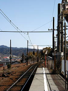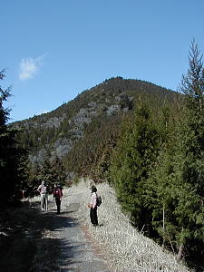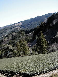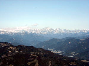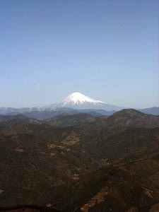 山登りを始めて以来、いや免許を取って以来、電車を利用した旅行はほとんど行っていない。 通勤等には使う電車も、登山や旅行の時にはかえって不便になる事が多いからだ。 今では、大抵の場合は登山口まで道路(未舗装の林道の事もあるが)が通じているし、大抵の観光地には大きな駐車場が用意されているので、時間的制約の大きい電車での旅はどうしても敬遠しがちになってしまう。 もちろん、電車でなければ出来ない旅もある事はよくわかってはいるのだが・・・。 同好の士であるF本氏からの誘いで、久しぶりに電車を利用する山行に行く事になった。 駅から登れる山で、一等三角点、近くに滝があり、富士山まで見えてしまうという豪華な内容である。 山は「八高山」、静岡の大井川流域の山で、当然ながら大井川鉄道を利用して行く事になる。 同行者はF本氏、F原女史、そして珍しく私の母親の三名である。 JR名古屋駅で集合するのは我が会ではよくあるのだが、そこから電車に乗る事は誠に少ない。 大抵は、そこから誰かの車に分乗して、山に向かうからだ。 今回は青春18切符を利用して金谷駅まで行き、大井川鉄道に乗り換えて福用駅まで行くという行程になるようだ。 東海道本線の快速でまずは豊橋へ、乗り換えて金谷駅を目指す。 浜名湖を渡るあたりから、窓の外に雪をかぶった富士山が見え始めた。 今日の快晴のおかげだが、目的地の遥か手前から見えているんじゃ、なんだか有り難みが無い等と贅沢な事を考えてしまう。 金谷駅で無事に大井川鉄道に乗り換えるたが、この駅からも富士山が見える。 有り難いような、有り難くないような・・・。 ともかく金谷駅を出発した列車は、中をよく見ると、まるでワンマンバスのようで、下車する時に料金を払うシステムのようだ。 本当にこの辺りの人にとっては、バス感覚なのかもしれない。 途中、タヌキの置物が山のように置いてある駅等を経由して、無事に福用駅に到着する。 福用駅は無人駅だが、最近建て直されたらしく、割に新しい感じで、なかなか洒落た建物である。 駅前の案内板をちらと見た後、駅前の道にある「八高山」の標識に従い、民家や神社の前を通り過ぎて植林の山道に入る。 しばらく身体を動かしていないせいで、とても動きが重く感じられる。 他の三人は軽々と、息もあまり乱れることなく登って行くが、自分だけは汗を沢山かきながら、ゼイゼイと息を弾ませながら、のろのろと登って行く。 茶畑の中の道に入る頃には、前を行く三人に、だいぶ引き離されてしまっていた。 仕事が忙しかったとはいえ、情けない事である。 これからは、もう少しは身体を動かすように心がけないといけない、等と反省を交えながら、頑張って三人の後をのろのろと付いていくのであった。 茶畑を何度か横切ると小文集落からの道と合流する。 帰りはこの道を行こうかと話しながらしばらく歩くと、ちょっと開けた場所に出たので、ここで休憩を取る事にした。 ここまでは、立ち止まって息を整えるくらいの休憩だけだったので、行動食と水分を補給すると、生き返ったような気分になる。 15分も休憩すると、汗も引き肌寒くなってくるので、あまり歩きたくなかった(?)が、出発する。 しかし、すぐに林道に出てしまったので、ここからしばらくは登山というより散歩気分の林道歩きとなった。 車の轍に水が溜まり、小さな池を作っている。 良く見るとその中に紐のような物が、何本も浮かんでいるではないか。 どうも蛙の卵のようである。 こんな所で卵が孵化したら、車が来た時に大変な事になる(蛙にとってはだが・・・)とは思ったが、あまりにもあちこちにあるので、どうにも出来ないし、いま現在、産卵しつつある蛙の姿を見ると何も言えない(言ってどうなるものでもないが)のであった。 そんな事をしているうちに、林道が交差する馬王平に着いた。 時刻は昼時というのもあって、ここで昼食にしようかとも考えたが、中途半端な場所だし、林道の真ん中で食事をするのもいやな気がしたので、小休止だけにする。 帰りに寄る予定の大垂滝へ続く道を確認してから、山腹に取り付き息を切らしながら、急登を登って行くと電波反射鏡とかの施設の横を過ぎ、巨大な杉木立の間を抜けて行く。 この辺りでだいぶ先行グループに差をつけられ、白光神社の境内で待ってもらう破目になってしまった。 神社に安全祈願のお参りをしてから、左の尾根筋を登って行くとほんの5分程で、ベンチのある展望の開けた山頂に飛び出した。 山頂からは、富士山がはっきり・くっきりと見えるのだが、だいぶん遠いせいでいま一つ迫力が無い。 その上、既に電車の中から見えていたので、いま一つ感動が薄いのである。 南アルプスも遠くに見えて、確かに大展望なのだが、それをぶち壊して余りあるのが吹き荒れる強風である。 春とはいえどまだ三月である。 832mとはいえ山上を吹き渡る風は、とても冷たいのだ。 これが風も無い小春日和な