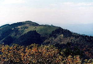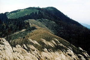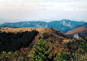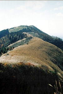 鈴鹿山脈も盟主である御在所岳、鋭峰−鎌ケ岳、セブンマウンテン最南部の入道ケ岳を過ぎると、訪れる人も少なくなり、静かな山歩きを楽しむ事が出来る。 その中でも仙ケ岳は比較的ポピュラーな山ではあるが、仙ケ岳から南西に連なる稜線は、訪れる人も殆どいない。 そこに御所ケ平・家老平という場所がある事を知ったのは、山歩きを始めて間もない頃に見たあるガイドブックでの事であった。 昔、さる国の殿様が何人かの家来を連れて逃げ込んだというこのあたりは、一面の笹とススキが広がる別天地だという。 ある晴れた日、深まりゆく秋の哀愁を求めて御所ケ平に出かけたのだった。 鈴鹿ICより石水渓に向かい、坂本の集落を過ぎた所で右折し林道ゲートに到着すると、既に数台の車が停められていた。 あまりにいい天気なので、同行者が準備に手間取っているうちに何枚か写真を撮る。 登山口となる営林署小屋までは、単調な林道をひたすら歩く。 周囲の木々も林道側は植林が多いが、対岸はそこそこ紅葉しているようだ。 30分程でようやく林道終点に到着する。 ここから山道になり少し行くと南尾根ルートと白谷ルートの分岐である営林署小屋(跡?)である。 営林署小屋の裏手から白谷ルートを進んで行く。 しばらくは、高巻き気味の道を進んで行くが、徐々に高度を落として沢の徒渉を繰り返すようになる。 沢沿いの傾斜の殆ど無い道を、何度も徒渉を繰り返しながら進んで行くと、営林署小屋から約40分で御所谷の出会いに到着する。 今日はここから御所谷ルートを進み、稜線に向かうのだ。 御所谷は白谷の出合いで、落差10m程の緩い傾斜の滝を駆けており、この滝を高巻くように御所谷ルートは始まった。 高巻きが終われば、後は白谷ルートと同様に沢沿いの道が続いている。 あまり歩かれないルートのはずだが、割と道はしっかりしている。 途中の二股でちょっと迷いかけたが、案外すんなりと稜線の縦走路に到着した。 このあたりでは、すでに木々も葉を落としており、積もった落ち葉がクッションになりとても気持ちが良い。 適当な広場もあるのでテントを張って一晩過ごしたいなどと言いだす人もいた。 確かに昼寝でもしたくなるような心地よさだが、物事が順調に運んでいると欲が出るのが人間で、折角だから仙ケ岳まで行こうかという事になる。 そこそこの急登を15分程で仙ケ岳西峰に到着する。 西峰は三角点があるものの、とても狭いので数人も人が来れば、居る場所が無い程である。 ここで早めの昼食とする。 快晴なので周囲の展望は素晴らしく、近くは東峰の仙ノ石から続く南尾根の稜線やこれから行く御所ケ平方面、遠くは北に連なる鈴鹿の峰々が遠望出来た。 景色を眺めながらのんびりしていると、そろそろ白谷を登って来た人達が山頂に到着し始めたので、場所を譲って先に進む事にする。 先程の御所谷分岐まで戻り、今度こそ御所ケ平方面へと進んで行くのであった。 暫くは広葉樹林の中の気持ちの良い尾根道を行くが、突然開けた所に出ると、その先は延々と続く笹とススキの平原であった。 ただの笹原ならば鈴鹿にはよくある風景なのだが、このススキ原にはしばし言葉を失い、誰もがゆっくりと歩を進めて行く。 左手には先程まで足の下にあったはずの仙ケ岳が、ススキの向こうにどっしりと腰を下ろしている。 この素晴らしい笹とススキの別天地を御所ケ平と言うのであろうか。 延々と連なるススキの中の道を進んで行くと、段々ススキの背丈が伸びて来て、終いには人間の背丈を越えるススキの中をわずかな踏み跡をたどって行くようになる。 そのうちにカモシカよけのフェンス沿いに進むようになると、ようやくこのススキ原も終わりに近づいたのか、樹林があらわれるようになる。 木々の下草はもちろん笹である。 ガイドブックによればこの辺りに御所ケ平の山名表示板があるはずで、そこで休憩するつもりであったが、いけどもいけどもあらわれないので、適当に休憩をとる事にする。 それにしても、自分たち以外は誰にも人間がいない。 一人の登山者にも会わないのである。 いかにマイナーな山域とはいえ、鈴鹿ではあまり無い事ではないだろうか。 でも、周囲の木は杉のように見えるが、そうするとそのうちこの楽園も、杉の木に覆われてしまうのだろうか。 人の生活の糧になるとはいえ、なんだか寂しい気がする。 植林帯(?)を抜けると、今度は一面の笹原である。 このあたりが家老平であろうか。しばらく単調な笹原を行き、ふと振り返ると既に傾きかけた太陽に照らされた御所ケ平のススキが風に揺れて光っていた。 再び樹林帯が近づくとこの山上の楽園も終わりである。 樹林帯を大きく下ると石水渓方面への縦走路との分岐に出る。 石水渓まで行って見たい気持ちを押さえて、今朝の林道方面へと下る茸谷(?)ルートへと向かう。 いきなりの崩落気味の危ういトラバースを過ぎると、植林の中の単調な下りとなる。 延々と下ると、沢沿