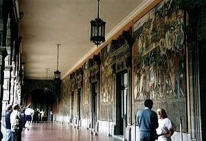 リベラ壁画 アステカ帝国の王宮の上に建てられた国立宮殿の内部には、2階の回廊部分にアステカ時代からメキシコ革命までを描いたリベラ壁画が描かれている。 非常に精緻な壁画で、おそらく美術的価値は大変に高いのだろうが、なんかやはりキリスト教的な匂いが漂っており、あまり好みではない。 ガイドの熱心な説明をよそに、M氏と添乗員のH女史と話しをしていたのだった。 H女史が豊田市の出身である事が判明し、名古屋周辺の話題で、盛り上がったものである。 |