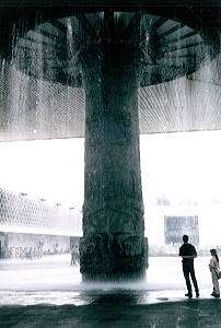 入り口の大噴水? 中庭の半分を覆う大屋根を支える柱で、写真では見えにくいが、笠のような部分からは、常に水が流れ落ちている。 柱には各地の遺跡のレリーフを模した彫刻が施されているらしい。 |