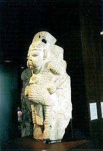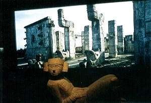 チチェン イツァ遺跡のチャックモール像 チチェン イツァ遺跡のシンボル、マスコット(?)であるチャックモール氏である。 なんでも生贄の心臓をこの像の上に乗せて神に捧げたというから、穏やかではない。 しかし、チチェン イツァ遺跡の戦士の神殿にいるはずの彼がこんな所にいる訳は、やはり重要な歴史文物の保管の為という事で、現在のところ本来の彼の家である戦士の神殿には、彼の二世(複製ともいう)が暮らしているそうである。 |