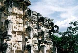 こんな顔がいっぱーい そう、この壁一面を飾る雨神チャックの装飾こそが、この建物が「仮面の神殿」と呼ばれる理由である。 チャックの装飾は300近い数になるという。 |