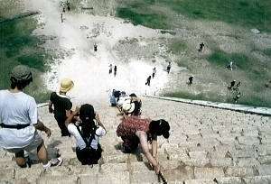 マヤ文明のピラミッドの例にもれず、ここの階段もかなりの急傾斜である。 登りはよいよい、下りは怖いという訳で、下りは毎度の如く鎖のお世話になる人が多いようだ。 その光景を上からみると、さながら綱引きでもしているかのように見えて、ちょっと不思議な感じであった。 |