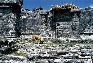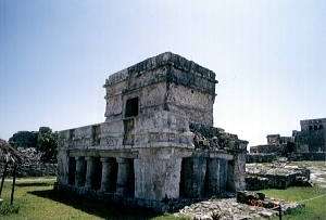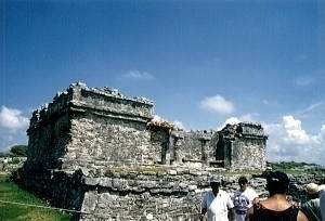 お猿の列車に乗っても、冷房が入っている訳じゃないので、やはり暑いものは暑い。 近くて遠い1kmを乗り越えて、遺跡に到着したのだった。 通常、熱帯雨林のジャングルを切り開いて造られているマヤ遺跡だが、ここでは珍しく海岸沿いに造られている。