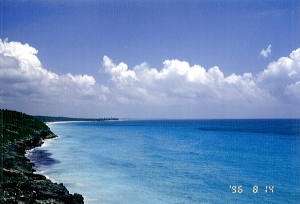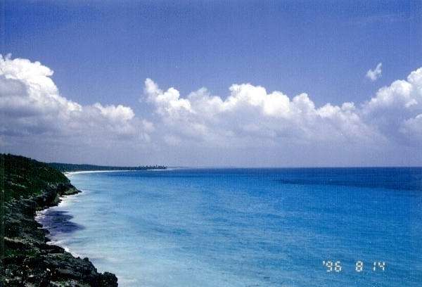 遺跡からみたカリブ海の眺め。 荒涼とした遺跡とは対象的に、あっかるく開けた海は、思わず泳いでみたくなる。