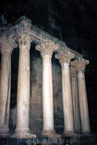 ローマ劇場 突然、開けた場所に出たと思ったら、そこがこの遺跡のメインであるローマ劇場だった。 なんでも中近東最大の規模があるそうな。 昼間ならもっと見栄えがするんだろうけどねえ・・・。 まあ、夜の闇の中でもその巨大さはひしひしと感じられたけど。 遺跡保護の為にフラッシュはあまり焚くなと言われてたので、ろくな写真が無いけど、雰囲気はおわかり頂けると思う。 みんな焦っていたので、いま一つ印象の薄い遺跡になってしまったけど、今では世界遺産に登録されているそうだ。 |
