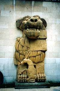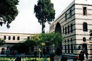 国立博物館(入り口) どこの国にでもある、ありがちな国立博物館である。 壁に遺跡の出土品を埋め込んでいるのもありがちな話で、世界最古のアルファベットが彫られたウガリットの石板や、後述のマリ遺跡からの出土品、ドゥラ・エウロポス遺跡の壁画等、シリアの国宝ともいえる品々が展示されている。 |