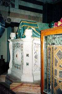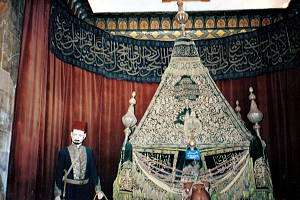 んで、これが サラディーン廟です。 ↑の銅像の英雄(十字軍の襲撃からダマスカスの街を守った)であるところサラディーンの墓所って事です。 まあ、イスラム教徒でない我々にとってはただの墓でしかないんだけど、観光地にはつきものですよね、こういうのは。 あー、そんな事を言うと遺跡自体がそんなものか・・・。 手前のガラスケースに入っているのが本物の柩で、奥の白いのはドイツから贈られた石棺って事です。 |