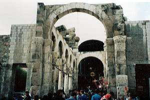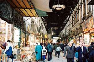 スーク(市場)の入り口 ここがダマスカスの最大の見どころとも言われるスークの一つスーク・ハミディーエ(の入り口)になります。 市場ってだけあって、金銀宝飾品から絨毯、民族衣裳、香辛料など何でも売っているので、見ていて飽きないのだ。 |
