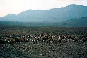 郊外はこんな風 歴史の街ダマスカスも郊外まで出ればこんなになります。 というか、実はパルミラへの途中で見た光景なんですけどね。 シリア砂漠で生活する遊牧民が飼っている羊達ですね。 現在放牧中といった所ですか。 時々、こんな羊がいる他は、何も無い荒野が延々と続いているのだった。 ダマスカスは言ってみればオアシスに出来た街なんだそうな。 |