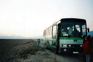 移動はバスで。 シリアでもヨルダンでも移動は基本的にバスを使います。 主要都市や観光地は言うまでもなく、ほんの小さな村にまでバス路線が張りめぐらされているらしい。 バス自体は結構いいバスで、多くは日本等から輸入した車を使っているらしい。 休憩中に撮った一枚だけど、本当に何も無いというのがよくわかるでしょ。 |