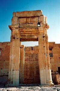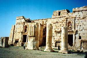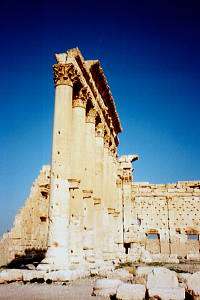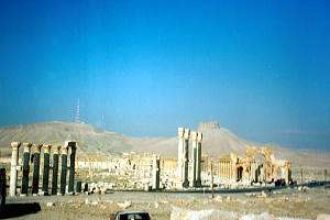 | 「パルミラ」は紀元前1世紀〜3世紀に栄えたシルクロードの隊商都市の遺跡である。 栄華を極めたこの都市も3世紀にローマ帝国の領土となり、イスラム朝の時代を経て、次第に時に忘れられた存在と成り果てた。遺跡の発掘が開始された時には、10mもの砂に埋もれていたという・・・。 かつて忘れ去られたこの都市も、今や世界遺産に登録されシリア最大の観光地と成り果てたのである。 遺跡の入り口である記念門付近でバスを降りて、まず訪れたのが「ベル神殿」である。 何故かと言えばパルミラ遺跡の中で唯一入場時間が制限されている場所だからと言う事である。 ほぼ200m四方の敷地をレンガ壁で囲った中に主神ベルを祭る神殿が建てられている。 神殿遺跡は壮大なものだが、ご覧の通りの青空で壁が白かったりするのでかなりまぶしいのだ。 やはり砂漠地帯に出かける時はサングラスは必需品のようである。 |