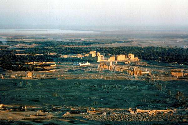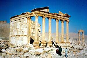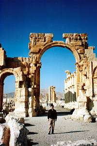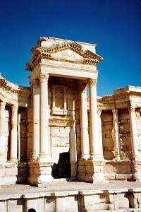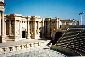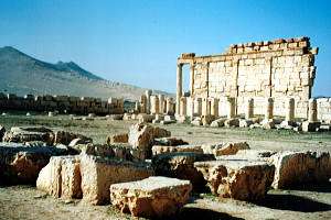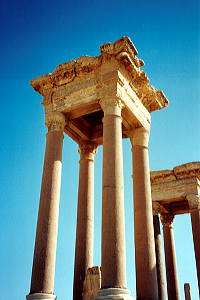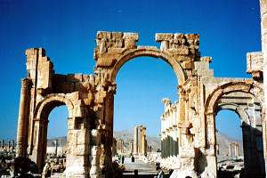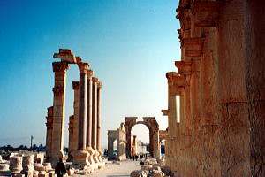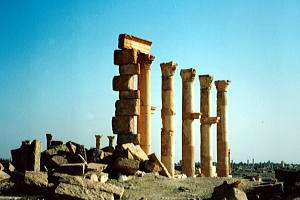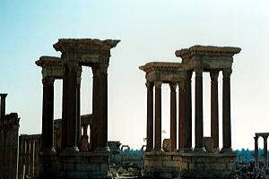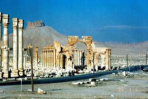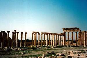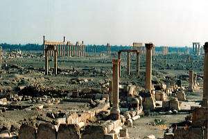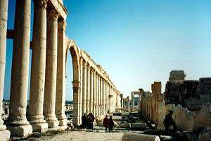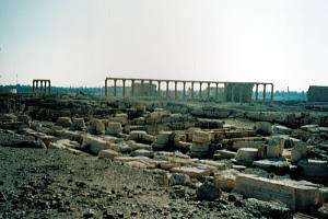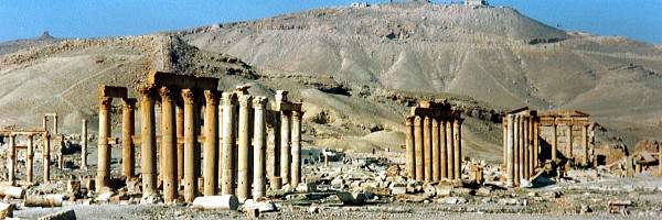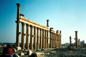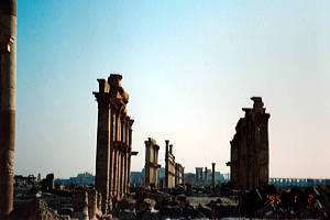 パルミラ遺跡のメインストリートにあたる列柱道路、記念門から最奥のディオクレティアヌス城砦まで700本以上の柱が道路脇にならんでいるのは、かなり壮観である。 この道路を中心に円形劇場や議事堂、浴場、四面門、葬祭殿等が立ち並んでいる。 |