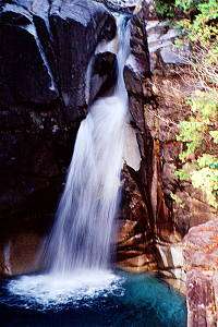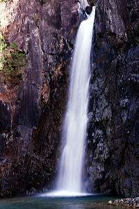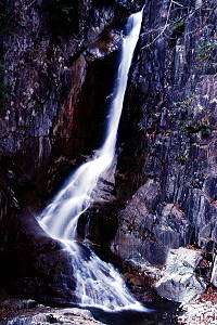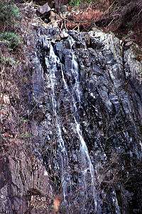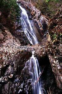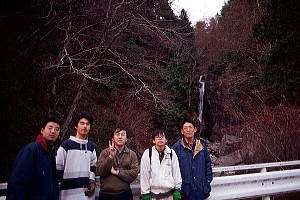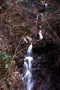 1999年も押し詰まってきた12月12日、何故か東海地区滝ツアーなるものを主催してしまった。 全瀑連の公式掲示板において、最近は東海地区の加盟者が増えて来た為、一度は歓迎会を兼ねて顔合わせしたいとの趣旨から、調子に乗って幹事を買って出てしまったのだ。 全瀑連のツアーはどこそこの滝に行くという事が先に決まっているのだが、今回は歓迎会から始まっているので、行き先が思いつかない。 行きたい滝は沢山あるが、自分が行った事も無い滝ではツアーにならないし、あまり遠い所や難易度の高い滝でもまずかろうという事で、何度も予定を変更しながらなんとか岐阜県は東濃方面ということで折り合いを付けたのであった。 さてツアー当日、急遽同行が決まった同志である三角点マニアさんの車で、集合場所の「道の駅 花街道 付知」に向かう。 曇り空ではあるが所々に青空も見えるまずまずの天候である。 中津川IC近くのコンビニで食料を調達後、以外に早いam8:30に集合場所に到着する。 今回の参加者は、自分と連れの三角点マニアさん、山さん、ぽたさん、よっしぃさんと、飛び入り参加予定の瀑岐隊長の6名である。 途中合流予定だったとんかつさんは、前日に合流出来そうにない旨のメールを頂いているので、残念ながら今回は不参加となった。 山さんとよっしぃさんについては今回が初対面なので、顔も車も判らない。 適当に時間を潰していると、見覚えのあるレオーネに乗ってぽたさんの登場である。 話しをしていると山さんとよっしぃさんも登場し、取り敢えず参加者が集まった。 自己紹介と簡単な行程の説明をしてから最初の目的地である高樽の滝に向かう。 瀑岐隊長は、前日の滝行きがかなりハードだったらしいので来ない可能性大との判断で、三角点マニアさんとよっしぃさんの車に分乗して出発する。 国道257号より付知峡へ向かい、総合案内所の前より渡合温泉方面への林道をひた走る。 1.5車線の林道はじきに地道になり15分程で高樽の滝に到着した。 道路脇の空き地に駐車し、早 速撮影モードに突入する。 高樽の滝は高樽沢が付知川本流に合流する地点に懸かる直瀑で、「岐阜の名瀑・名峡」によると落差40mなのだが、現地には落差21mとの看板があった。 確かに40mも無いような気がするが果たして・・・? そんな事を確認してる内に、他の人々は山のほうへ分岐する林道の橋の上からの撮影を済ませ、河原へと降りていく。 山さんは最近買ったという総重量6kgの三脚を担いでいく。 見てるだけで重そうだが・・・。 自分も橋の上から何カットか撮影してから、河原へと降り始めるが、その頃にはみんな道路へと戻りつつあった・・・。 ともあれ、河原に降りて心ゆくまで撮影させて頂く。 前回来た時は、山の帰りだったしアベックがいちゃついていたので、急いで数枚撮っただけで帰ってしまったのだ。 上へ戻ってみると、よっしぃさん達は滝の銚子口へ行ってみたり、道路沿いに落ちている別の支流の滝を撮影したりしていたようだ。 ちょっと時間を取り過ぎたかと恐縮しながら、次の目的地の渡合温泉へと向かった。 ところが、しばらく走ると三角点マニアさんが、対岸に二条に落ちる滝を発見する。 近くの路肩に停めて、案内図を見ると付近に鈴ケ沢の滝というのがあって、遊歩道がそこまで通じているらしい。 さては対岸に見えるあれが鈴ケ沢の滝かと深く考えずに、近くに見えた吊り橋の方へ向かったのが間違いであった。 この吊り橋は河原から30m程上にワイヤーを張り、その上に板を渡しただけのかなり危うい代物で、「三人以上同時に乗るな」と書いてあるのだが、怖くてとても1人以上は乗る気がしない。 順に一人ずつ渡るのだが、想像以上に揺れるのだ。 しかも日陰の部分には、以前に降ったと思われる雪が少し残っており、すべるのではないかと余計に不安をあおってくれる。 無事に渡ったのも束の間で、今度はここから先に進む道が無いではないか。 尾根の方に続く怪しげな消えかけた踏み跡と、谷筋へと降りる完全に朽ち果てた階段があるのみだ。 尾根に上がり無理をすれば何とか行けそうだったが、そこまでして行く程の滝でも無いと意見が一致したので、今回は引き返す事にする。 怖い吊り橋をまた渡り直して戻ってみると、倒れた看板に、無情にも通行止めの文字が朱書きされていたのだった。 今回は遠望ですますかと三脚を立てていると、どうやら対岸の滝は鈴ケ沢の滝では無い事が発覚し、今度こそまともな遊歩道を滝に向かって歩いて行ったのだった。 10分程歩くと支流に落差30m程の2段の滝が懸かっていた。 今度こそ鈴ケ沢の滝だ。 早速、撮影タイムに入るが、遊歩道の橋の上からでは写真にならないので、みんなで危うげな斜面を滝の方へと進んでいく。 上段の滝壺付近に行きたいところだが、かなり切り立った岩場のため断念して、下段の滝の前で三脚を立てる。 上段の一部が木に隠れて見えないが、なかなか水量もあるいい滝である