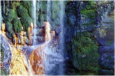 滝前の朽ちた看板と、滝の苔が歳月を物語っていた。