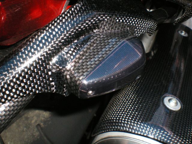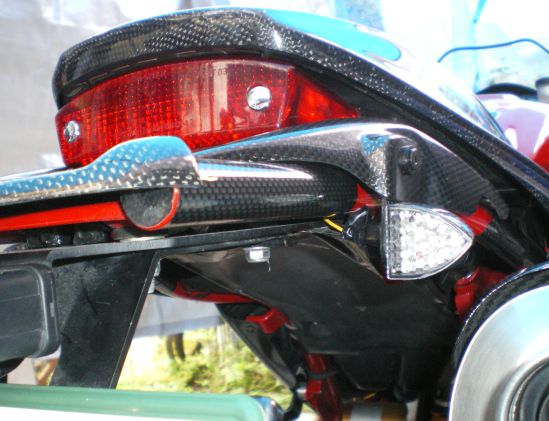 汎用ウインカーに変更。ラジコン用カーボンシートを用いて、固定部をカバー。