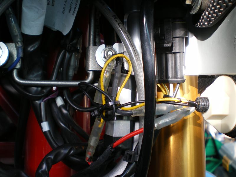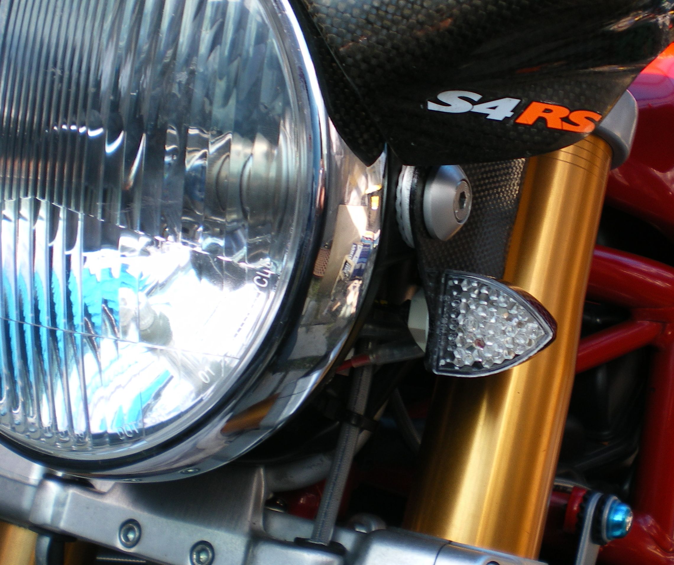 フロントに自作ステーでLEDウインカー装着。但し、ウインカーリレーがECUユニットに内蔵されていて、