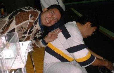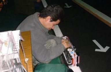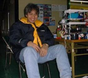 マシーンに寄りかかって睡眠中?のイハラッチ 一番ライトが輝いていた小林ヨットクラブのアコードのピットイン