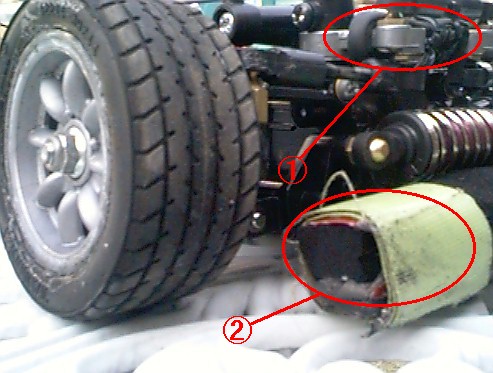 下の写真の@のステアリングワイパーアーム部のガタ止め(ミニ四駆のラバータイヤを半分輪切りにして使用)