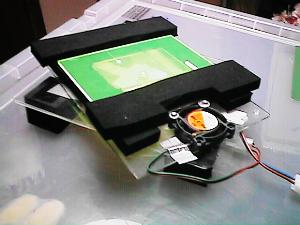 自作の回転式メンテ台:アクリルプレートをカットしファンと放電機付き