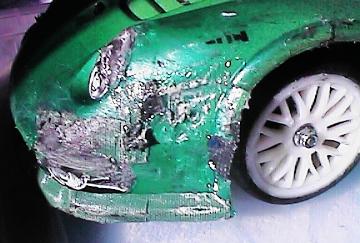 (今迄何度もヒットさせて補修材を盛りだくさんに、貼りつけたり,