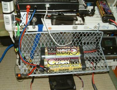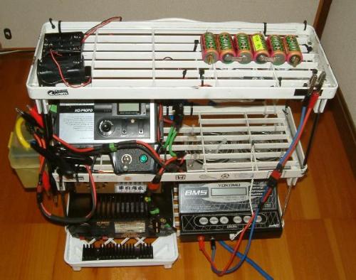 240円の台所用台上下にナイロンバンドで安定化電源、放電器、充電器、ニッケル水素用充電器、
