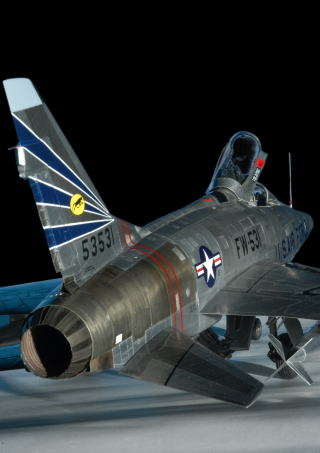 | 写真のF-86F、F-100Dは表面にアルミの薄板を貼った作品ですが、すばらしい質感の表現と正確なディテールのため実機の写真のようです。是非、展示会で見てください。また、1/144スケールの小さなモデルも見逃せません。鉛筆ほどの太さの胴体に本当に小さな星型エンジンが入っていて、計器板ももちろん再現されています。こちらも展示会で確認してください。感動しますよ! |