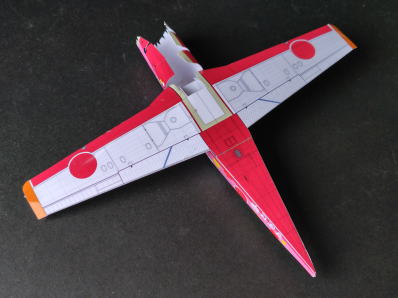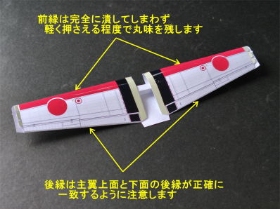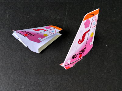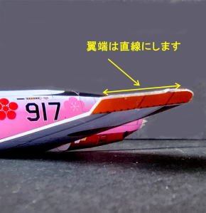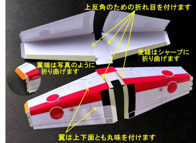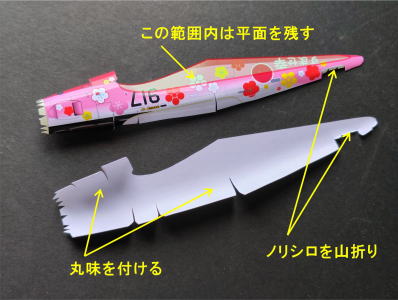 その際、図示のの箇所は丸めず平面のままとします。尾翼を取り付けるノリシロは90度に山折りします。