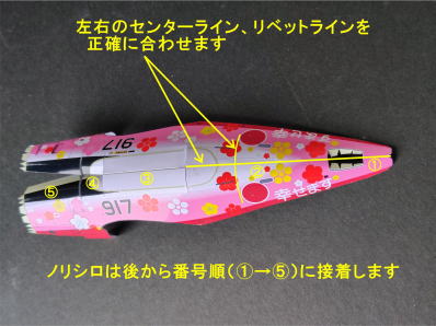 10.胴体前下のノリシロを接着します。後から番号順に接着します。