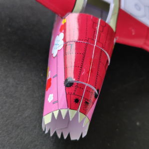 12.胴体下面パネルを切り出しノリシロを山折り、全体に丸味を付けます。胴体下面パネルを胴体機首部の内側に差込みながら