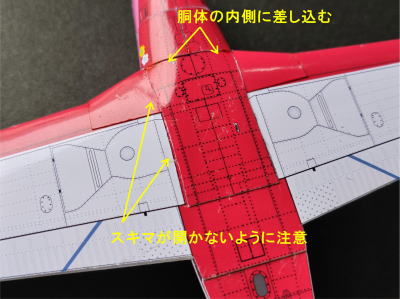 ノリシロを密着させます。モデルを真上から見て、胴体と主翼の取付が直角になっていることを確認します。