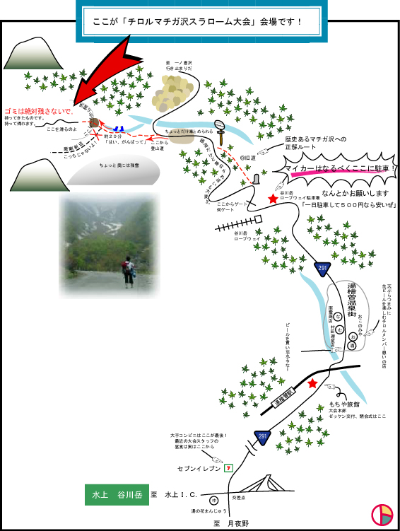 駐車場から30分程山道を歩きます。とにかくゴム長靴が最高 (2)雨具 雨合羽、折りたたみ傘は必需品! (3)替えの靴下2枚 (4)汚れてもよいスキーパンツ。 マチガで転ぶとちょっと汚れるかも・・・ 登る途中は木の枝が邪魔になったりもするので、スキーパンツは丈夫で安心。 (5)長袖シャツ(アンダータートル可) Tシャツは避けましょう。硬い雪渓で転ぶと擦りむくので、長袖が安全。 登るときは暑いのでTシャツで。雪渓について汗が引いたら長袖に着替えよう。 ヤッケ・ウィンドブレーカーもお忘れなく。 (6)スキー板とストックは予めひもでしばっておきましょう。 登るときに持ちやすいように。 (7)スキー靴が入る大きなザックで登ろう。 肩下げや手持ちは避けましょう。 (8)食料(弁当、お菓子、飲み物) マチガ沢には売店はありませーん! 水は雪渓下部で汲めます。ビールも忘れるな! (9)軍手があれば便利。 スキーグローブは濡れてしまって使いづらい。ゴム面のついた軍手が最適。 (10)タオル数枚。シャツの代え。汗かくよ。 (11)カメラ 晴れた日の景色は最高。 (12)日焼け止めクリーム。後で後悔しない為に・・・ (13)その他…翌日も滑る人は、宅配便などのビニールスキー袋に入れて林の中に残置してくると楽。あと行楽用ビニルシート、折りたたみイス等等、詳細は「図解マチガ沢持ち物」をご覧ください。 |
