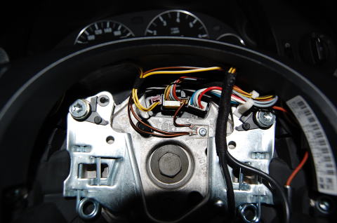 エアバッグに2つのコネクタを接続しステアリングへ固定します。
