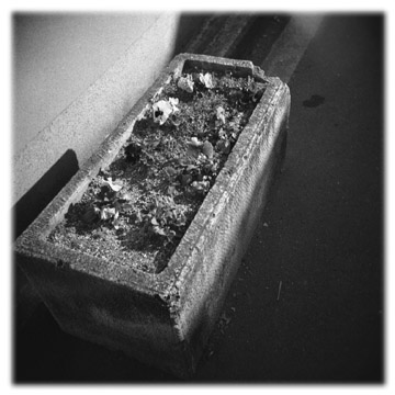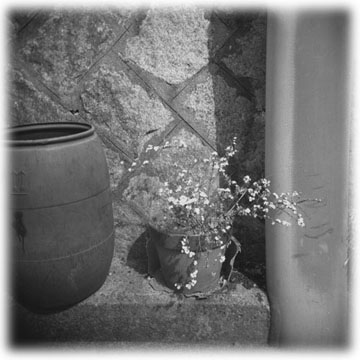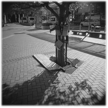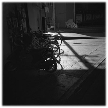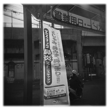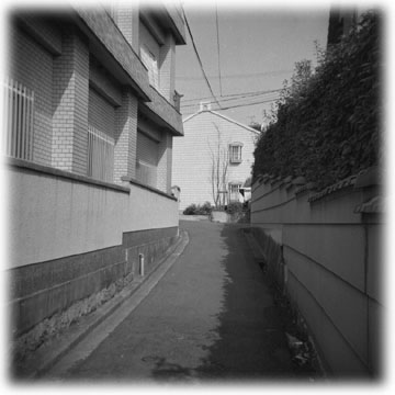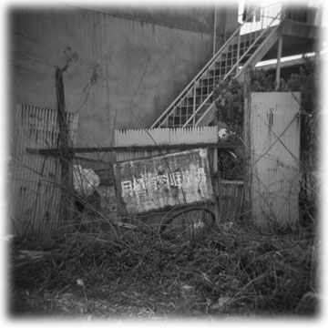 HOLGAはホルガと読みます。意味は分かりません。中国製のいわゆるトイカメラですが、その低性能故の独特な描写に愛好者が多く、LOMOと並んで結構なムーヴメントを起こして居るとも言えるでしょう。私もそれに乗っかってみようということで、HOLGAを購入しました。 使う前に改造 本来はセミ判のカメラで、フィルム開口部を取り外すと、6×6になると言うものです。しかし、フィルム開口部を取り外すとプラスティックのコバそのものの開口部となって、フィルムの平面性(そんなもの初めから怪しいものですが)やスクラッチの心配があります。そこで、この開口部に填っているアパーチャグリルとでも言うべきパーツを改造します。改造は簡単でカッターかオルファの鋸(私はこちらを勧めます)で、四角「錐」になっている部分を切り取ってしまえば良いだけです。切り取って再び装填したのがこの写真です。次に、裏蓋の改造です。裏蓋には圧板も何もないので、ただでさえ平面性の確保に苦労する120フィルムですから、ほんの少し手を加えておくことは、低性能のHOLGAとは言え得策であることに間違いはありません。ネットで調べてみると殆どの人が磁気カードを利用しているようなので、自分も使用済みのJRのカードを使いました。 カードの固定には厚みのある両面テープが便利です。圧板の他にもフィルムのロールを押さえるバネもついでに作りました。いい加減なものですが効果はどうやらあるようです。圧板も押さえバネもあまり強く押さえすぎると、巻き上げが極端に重くなったりしますので、ご注意を。また、巻き止め装置などと言う高級なモノは当然ありませんから、裏紙のコマ数字を見るための窓を開けておくのは忘れずに。 私のホルガはレンズの前にフィルタ径変換リングをエポキシで無理に接着し、φ52mmのフィルタとフードを装着できるようにしてあります。上の写真では黄色のフィルタを装着してあります。フードは余り深いと四隅にケラレを生じます。私はあり合わせのフードを装着しましたが、深すぎて作例ではきっちりとケラレています。ご注意を。使ってみる ホルガはレンズの焦点距離が60o、絞りはF8固定でシャッタ速度も1/100秒固定のエバーセット・シャッタ(ボタンを押せばセットしなくても切れる)ですから、早い話が6×6の「写ルンです」でピント調整(ただし目測)が出来る・・・みたいなものです。ですから、ある条件下でしかぴったりの露出にはならず、フィルムのラチチュードに頼って撮影されるものです。細かい露出調整はオーバーの場合はNDフィルターで減光し、アンダーの場合は三脚などに固定し(ただし固定用の三脚ねじ穴は無く自分で改造して装着する必要がある。)エバーセットであることを利用してシャッタを何度も切る、つまり多重露光で光を稼ぐというテクニックを使わねばなりません。暗いところの撮影には相当の根性が必要でしょう。 後先になりましたがフィルムの装填は昔のカメラ同様で、スプールにまきつけて、背面の赤窓で数字を見てコマを送るというものです。撮影したら必ず巻き上げるなどの、自分のルールをきっちりと作っておかないと、「このコマって露出されてたっけ?」と言うハメに陥ります。準備が出来たら撮影。 撮影結果と感想 ホルガに詰めるフィルムですが、今回の作例では手元にあったモノクロフィルムのイルフォード400DELTAを使いましたが、次回からはラチチュードの非常に広い、イルフォードXP2スーパーかコダックのT400CNを使おうと思います。どちらも色素画像フィルムで露光過多に強く、独特のヌルリとした調子があって、割合ホルガに向いているかも知れません。出来上がりは作例をご覧下さい。 さて、ホルガですが、多くの人はホルガニストとして、独特の劣悪な画質を生かした作品を作っています。またある人は改造カメラのベースとして利用したりもしています。まぁ、こういうカメラで「作品」を作るというのは、なんだか独特のスノビズムが鼻について嫌らしくも思いますが、出来た作品がそれなりに「いいなぁ」と感じられれば、それはそれで立派な作品だと思います。私はこのカメラでホルガニストやアーティストを気取るつもりは毛頭ありませんし、また高級カメラに対するアンチテーゼをひけらかす積もりもありません。しかし、このプリミティブなトイカメラを時々取り出して写真を撮るのは、なかなか愉快な行為であることは確かです。 作例集 |