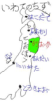 「え〜と、東北の本州の先は青森だから、岩手は・・・仙台の上でしょ? でー、盛岡って?・・・あ、わんこそば!」たぶんそんなところでしょう。一般人の思いつくところは。図で説明いたしますとこのようになります。(笑)  |