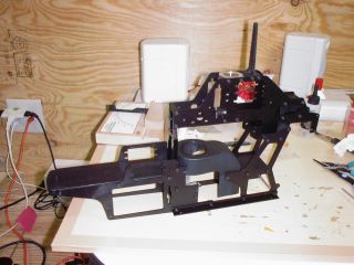 フレームです。メカとジャイロのベット、 一部のメンバーがプラ製であとはアルミ製。 しかも、このアルミ、かなり硬いです。 なんか、満足感があります。 ビスが多く、仮組み→ロックタイトの 繰り返しです。 |