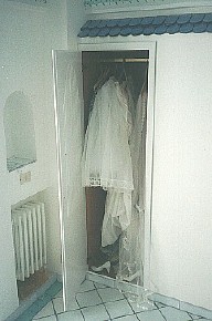 | 新しく買うのはもったいない気がして、Gooに借りました。 パニエはクルクル筒状に巻き、100円ショップのベルクロテープで留めて小さくし、かさばるドレスやベールはそおっと丸めてつぶれないようにバッグへ。小物もしっかり入り機内持ち込みの大きさにも合う、とても使えるバッグ。 |