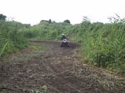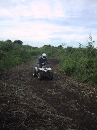 | ↑の、わんぱく ATV っこに追いかけられてる 本日 ATV 初乗車の sakai さんの友人さん(笑 後方の梅津Jrクンがチョー余裕(笑 |