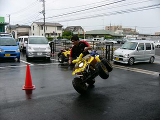 | バイクで来ちゃった、某「愛する会」のオーナーさんも 片輪走行に挑戦中(^^; バランスが難しい… |