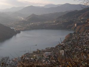 駅前に降り立てばすぐそこにあるように見えるので簡単に山頂に着けそうな気がするが、歩けば小一時間はかかる。山道の登りは30分ほどだが、適度に斜度があり、12月中旬だというのに多少の汗をかかされた。落ち葉が散り敷かれた広い道のそこここに苔のついた岩が顔を出している。見通しのよくなった木々の合間からは、左手に奥高尾の山並みが大きく、とくに正面の城山が悠揚迫らぬ姿で心地よい。右手に大きく開けたところがあり、相模湖を眼下に収め、彼方には扇山や大菩薩が望める。この展望は山頂からでも得られるが、アンテナ施設が少々気になるところだ。