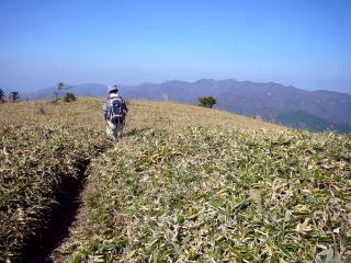 | 登山道は緩やかで見晴らしの良い笹原の中に通じている。小さなピークを越すとすぐに頂上に到着した。眺めは360度で地図を広げて山座同定をした。 |