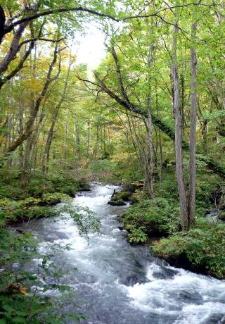 歩く人はまだ少なく静かで、穏やかな奥入瀬の清流沿いを歩いていく。