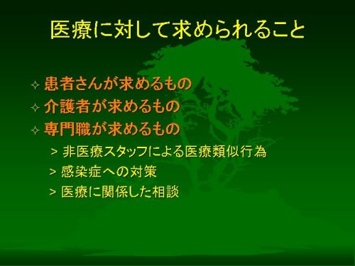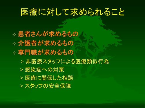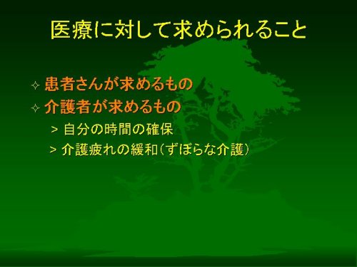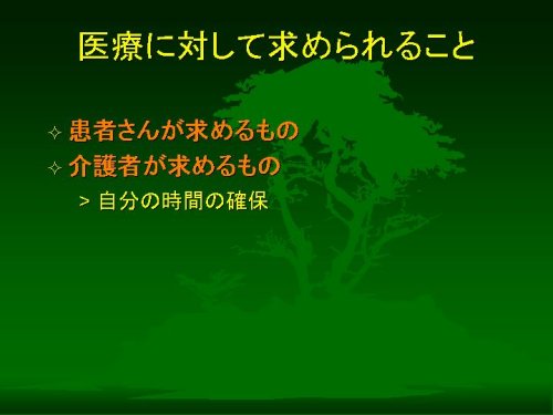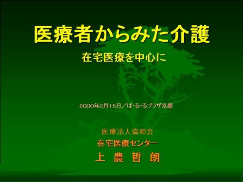 今日は、「医療者からみた介護」というテーマでの話題提供のご依頼を受けました。じつはテーマがちょっと漠然としていることと、今日おいでになるみなさまがどのような話をお聴きになりたいのかということがいまひとつ絞りきれませんでして、ご期待にそえるお話ができるかどうか少々心配しております。