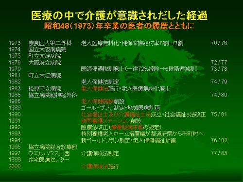 事前に今夜の話の内容の概略をお送りしておりますが、これ、まことに漠然としたことを書いております。要するに、私がごく普通の医者だったころ、普通の医者ってどういうものか難しいわけではありますが、ま、いわゆる「お医者さん」していたころから、現在のようにちょっとヘンな医者になるまでの経過が、日本の介護を巡る経過と同時進行していたように思っていますので、ごく普通の医者がみた介護現場の変化と現状というようなことについてお話してみようと思います。