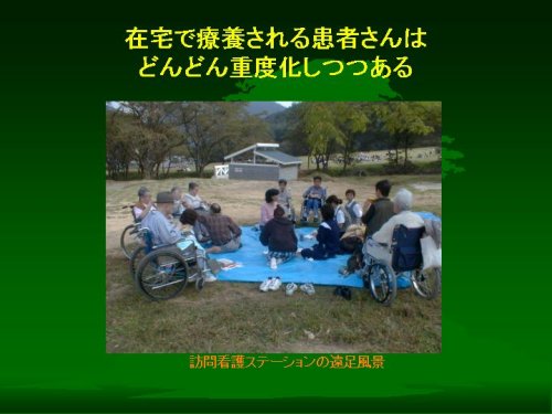 医療系とは、ロングセラー本「病院で死ぬということ」の作者で東京のホスピスの責任者をしておられる山崎章郎さんや、お名前をご存じのかたがおられると思いますが、尼崎の神代尚芳さん、河野博臣さんなどが熱心になさっている、いわゆる在宅ホスピスや、神経難病、筋萎縮性側索硬化症とか脊髄小脳変性症などの在宅ケアなど、医療行為、それもかなり高度な医療行為が必要なものです。
