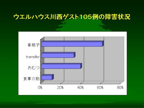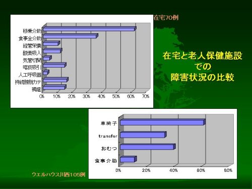 これは参考ですが、ウエルハウス川西の一般療養棟に入所しておられる105名のかたの具体的な障害の状況のグラフです。もとのデータの違いがありまして、同じフォーマットでの比較ができないので申しわけないのですが、このグラフの「トランスファー」が「移乗介助」です。在宅の患者さんの半分程度しかありません。食事介助も10%ほどで、在宅のかたの三分の一です。ちなみに経管栄養は3%程度で、やはり在宅の三分の一でした。