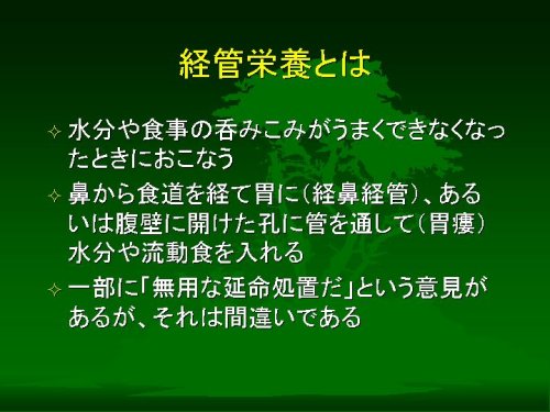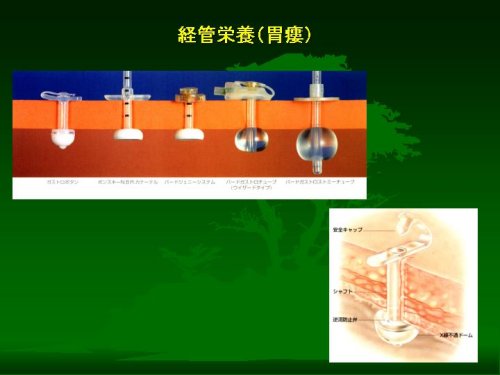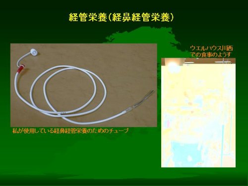 それでは、ちょっと本題からははずれるかもしれませんが、経管栄養以下の医療的な処置の実際について、すこしご説明しておきます。