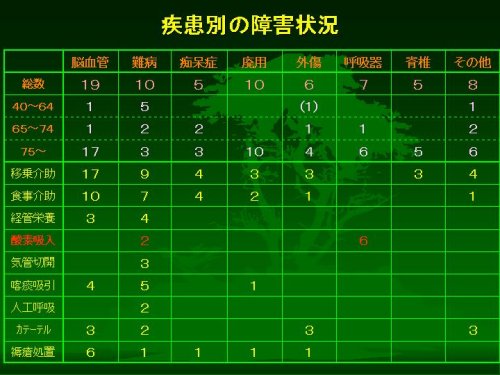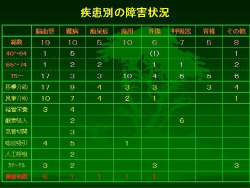 そして、脳血管障害のかたとは対照的に、医療処置を要するかたの割合が高く、また数字から分かりますように、おひとりの患者さんで重複した処置を要するかたが多いのが目立っています。