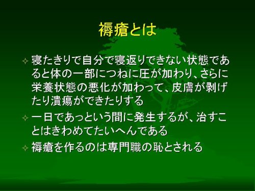 つぎに寝たきりの患者さんにはしばしばつきものである「褥瘡」についてです。